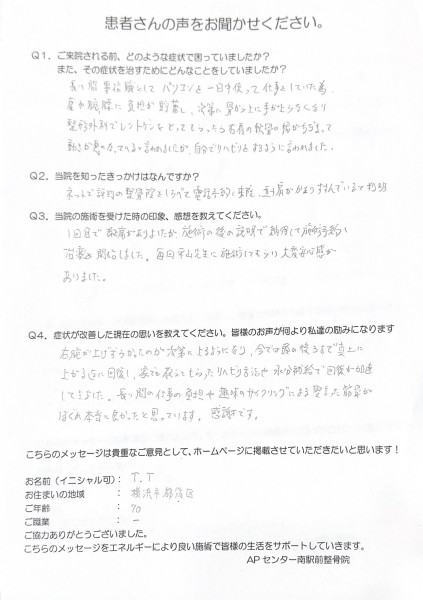 一歩踏み出し頼れる整骨院にめぐり会えました。 (T.K様 70代 女性 )