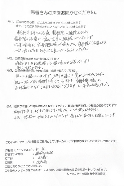 ネットでAPセンター南駅整骨院を見つけ施術を受けたところ、最初の数か月間はどこを触られてもこれまで経験したことがない痛みでした。この施術を続けられたのは初回先生からわかりやすい説明と施術毎のフォローがあったからです。これまでの10数年間悩み続けてきた納得でき腑に落ちる物があったからです。